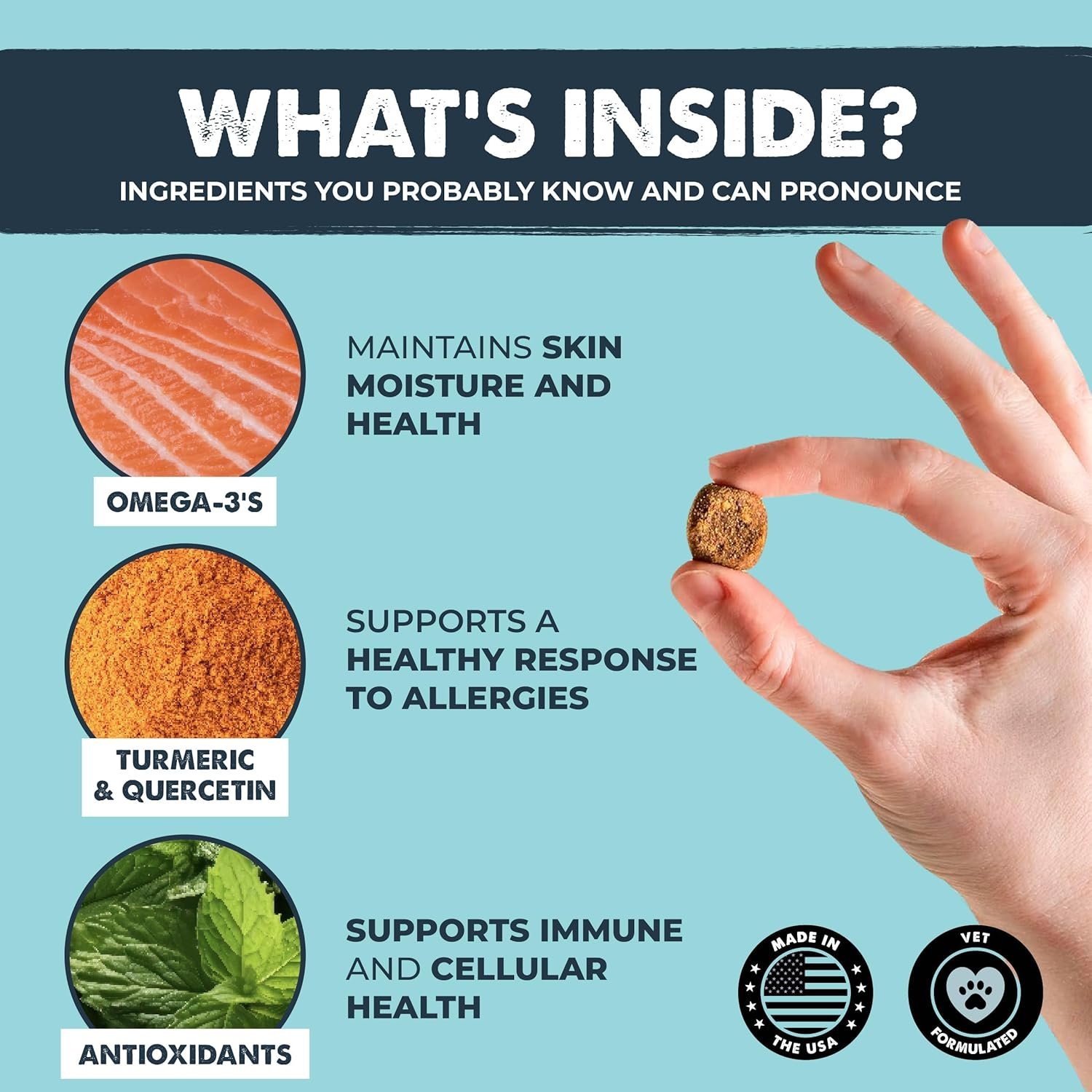 • Soothe the Itch: Our immune and allergy supplement unleashes the dynamic power of Omega-3’s, Quercetin, and Turmeric to promote immune system health and support your pups season allergy response.